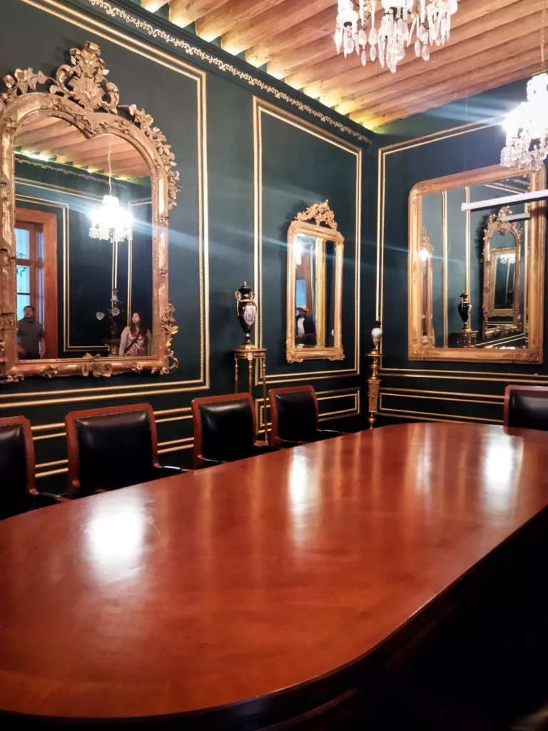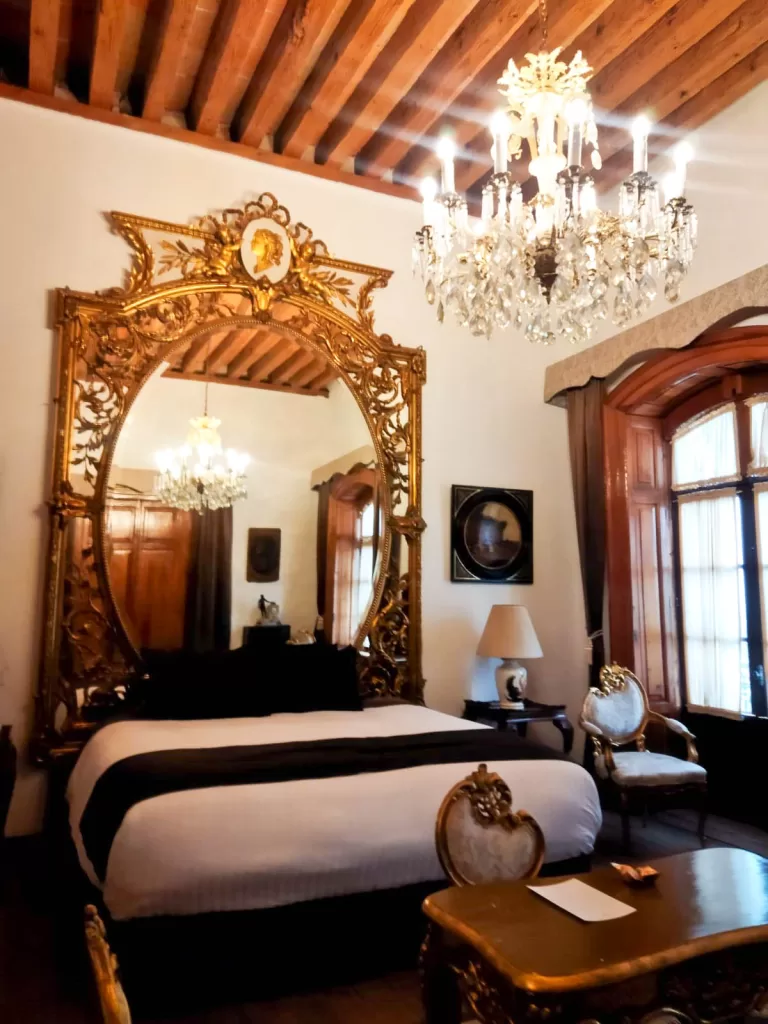 Grandes espejos con marcos dorados decoran algunos muros, mientras que las paredes suelen estar adornadas con cuadros, fotografías antiguas o piezas decorativas que recuerdan la historia de la región. La iluminación también juega un papel importante: lámparas de estilo clásico y candiles de cristal aportan una atmósfera cálida y ligeramente nostálgica.