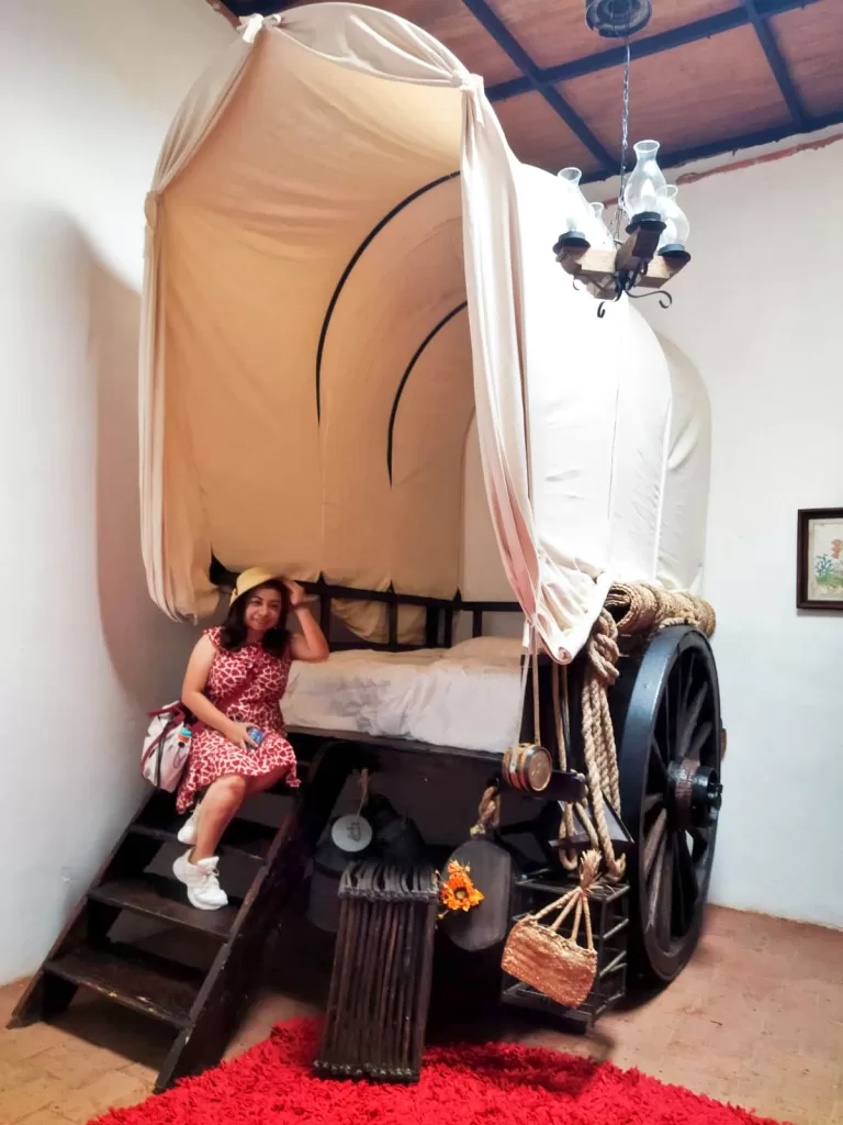 Dormir en una habitación de la hacienda es, en cierto modo, prolongar la experiencia del recorrido. Al caer la noche, los pasillos silenciosos, los patios iluminados y las paredes antiguas generan una atmósfera difícil de encontrar en hoteles modernos.