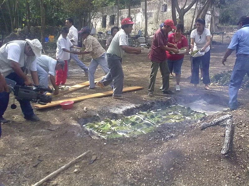 El mucbipollo, cuyo nombre proviene del maya mucb (enterrado) y pollo (pollo), es un platillo ritual más que un simple alimento. Se prepara una vez al año y su cocción tradicional en horno de tierra —el pib— representa el regreso a las raíces y el contacto directo con los elementos naturales. Este gran tamal de masa, achiote y carne se envuelve en hojas de plátano y se cuece bajo tierra, evocando el ciclo de la vida, la muerte y el renacimiento.